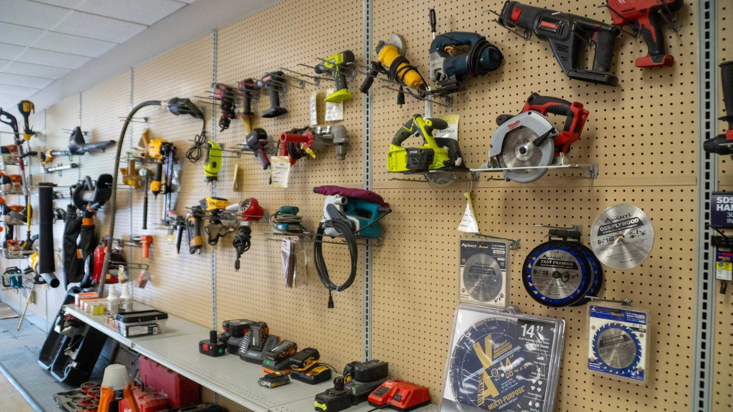 Photo collage of equipment and machinery for rental, including outdoor power tools, small construction equipment, and landscaping machinery displayed inside and outside a store.